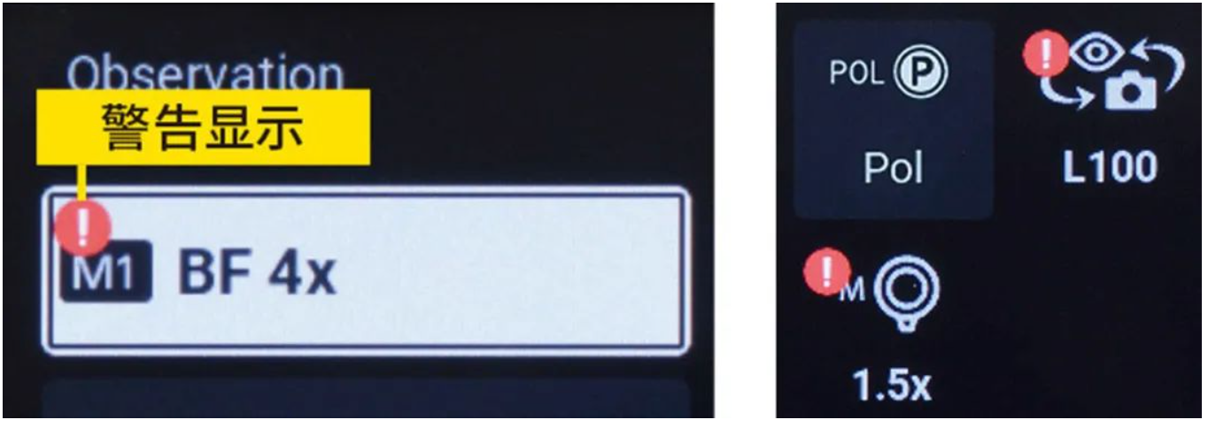 如果当前的显微镜设置和当前模式保存的内容不一致,即会显示警告。此外,还可在画面上确认需要修改设置的显微镜部位。有助于快速发现设置错误,减少操作错误。