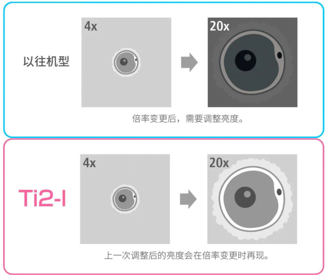 按钮等操作系统集中配置在显微镜正面的易操作位置,便于在观察显微镜的同时操作按钮。只需按一次按钮,即可电动切换观察模式。可通过较少的动作操作显微镜,方便专注于观察研究对象本身。除了4个模式按钮外,观察模式还可连接到2个功能按钮上。可将不同倍率的观察及相差 / NAMC / DIC观察等连接到按钮。同时前方两个功能按钮还可以保存其他功能,如屏幕的开关,转盘的跟随旋转等。此外,还支持导入激光观察等。ECLIPSE Ti2-I配备能够记忆最近一次调整亮度的“LIM(光强度管理)”功能。只需更改倍率,即可自动再现上次调整后的亮度。不必在每次更改倍率及观察模式时都重新调整一遍亮度,有助于提高作业效率。