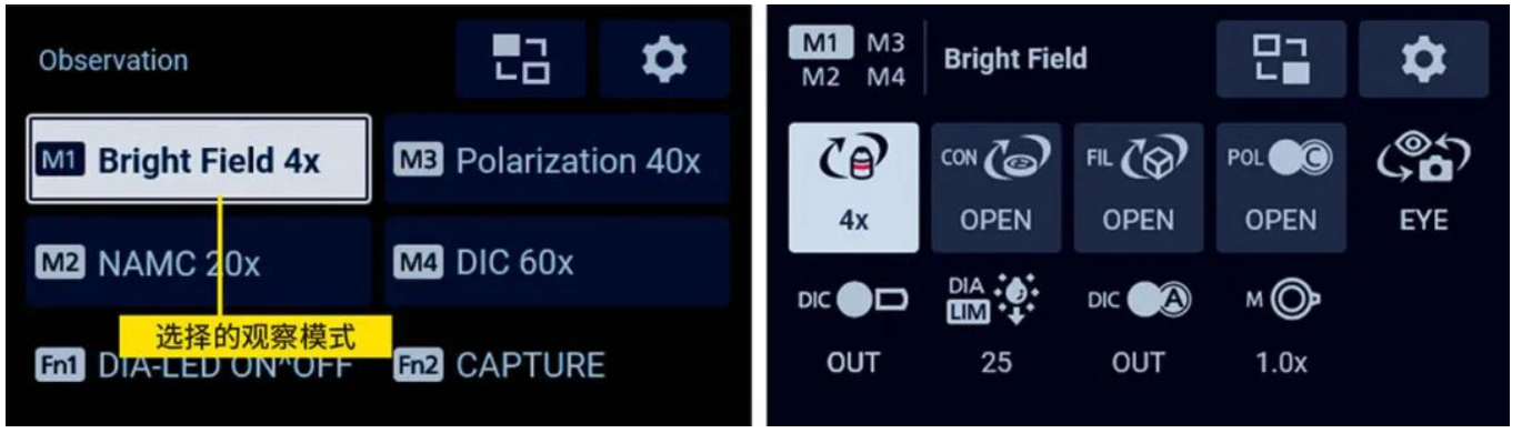 通过液晶显示屏即可轻松确认当前选择的观察模式。即使多人共用一台显微镜,也能轻松了解显微镜设置状态,使用起来更放心。在详细信息画面,可通过直观的图标确认各模式的登录设置。