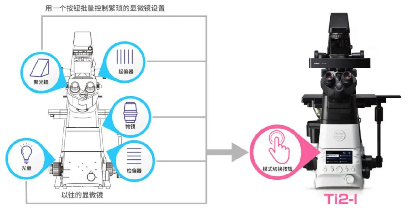 以往的显微镜在每次变更观察模式时,都需要用户自行操作显微镜的多个部位进行优化。而ECLIPSE Ti2-I则可以将每个观察模式的显微镜设置连接到按钮上。只需按下前方的按钮,即可一次性更改显微镜设置,从而实现观察模式的一键切换,简化观察的工作流程。